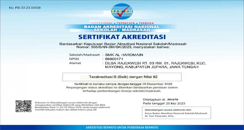 SMK Al Haromain – Berdasarkan Surat Keputusan Ketua Badan Akreditasi Sekolah/Madrasah Nomor: 555/BAN-SMK/SK/2023 Tanggal 25 Mei 2023, Tentang penetapkan hasil Automasi Akreditasi Sekolah/Madrasah Tahun 2023. Dalam surat keputusan tersebut terukir nama SMK Al Haromain dengan Predikat “B” untuk akreditasi sekolah 5 (lima) tahun kedepan periode 2023-2028.